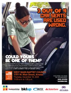 Artesia, NM – The New Mexico Department of Transportation Traffic Safety Division (NMDOT TSD) and Safer New Mexico Now (Safer) will host a free Car Seat Inspection Clinic from 11:00AM to 1:00PM, Thursday, December 18, 2025, at the West Main Baptist Church, 1701 W. Main Street, in Artesia, NM.