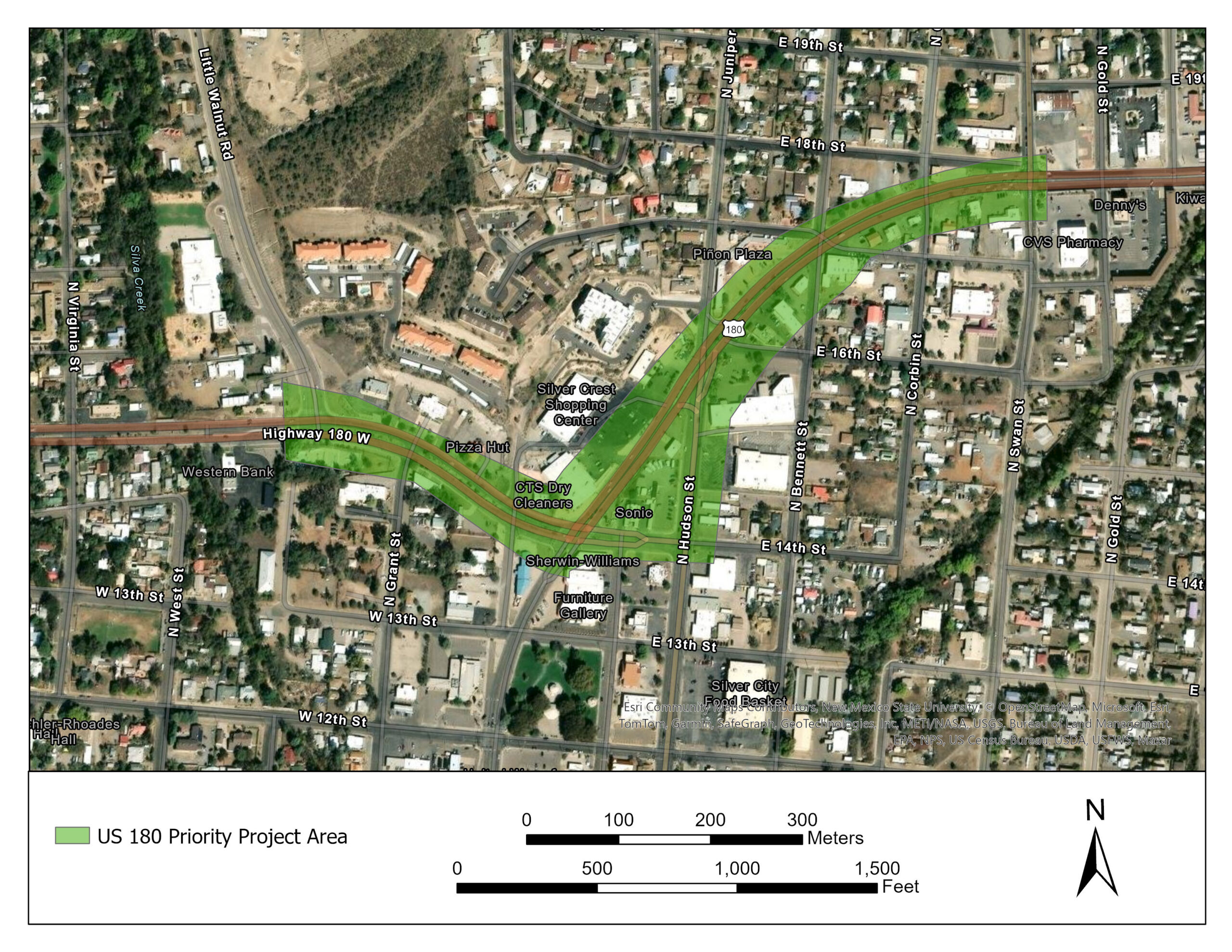 The first phase identified for this scoping effort (Phase One) focuses on one of Silver City’s busiest areas—the corridor surrounding the US 180/NM 90 intersection (see Figures 3 and 4). This phase includes the segment of US 180 between North Swan Street and Little Walnut Road, as well as the triangular area formed by US 180, East 14th Street, and NM 90 (North Hudson Street).